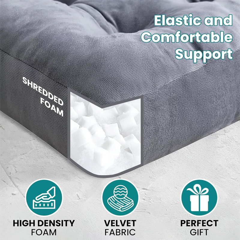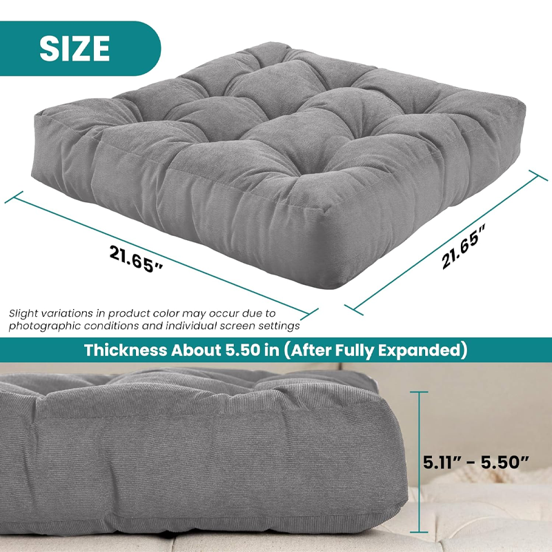 This product is a generic large floor pillow cushion intended for sitting or relaxation on flat surfaces. It provides basic thickness and support for everyday home use. It does not incorporate patented designs, licensed patterns, or trademarked elements.