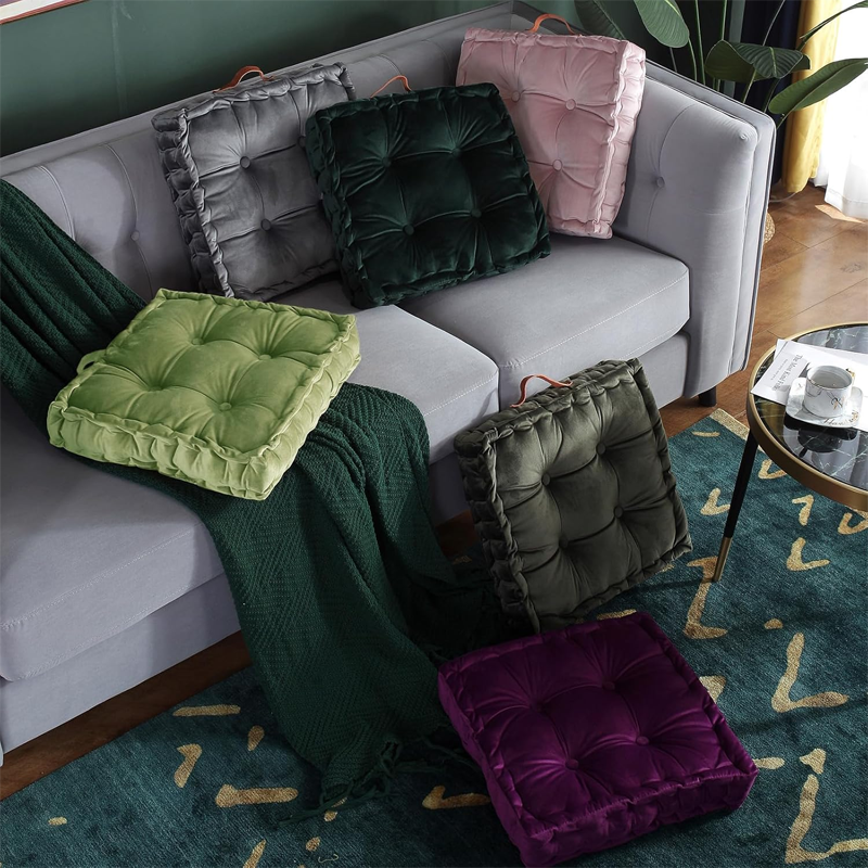 This product is a generic square seat cushion with added thickness and a carry handle, suitable for chairs or floor seating. It provides basic padding for everyday home use in living or sleeping areas. It does not incorporate patented designs, licensed patterns, or trademarked elements.